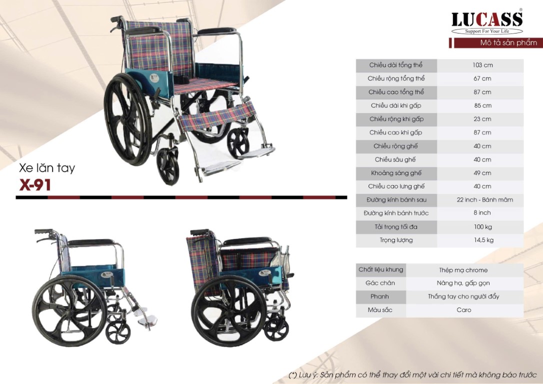 - Dễ dàng sử dụng: Xe lăn Lucass X91 thường có thiết kế đơn giản, dễ sử dụng, phù hợp với nhiều đối tượng người dùng khác nhau.